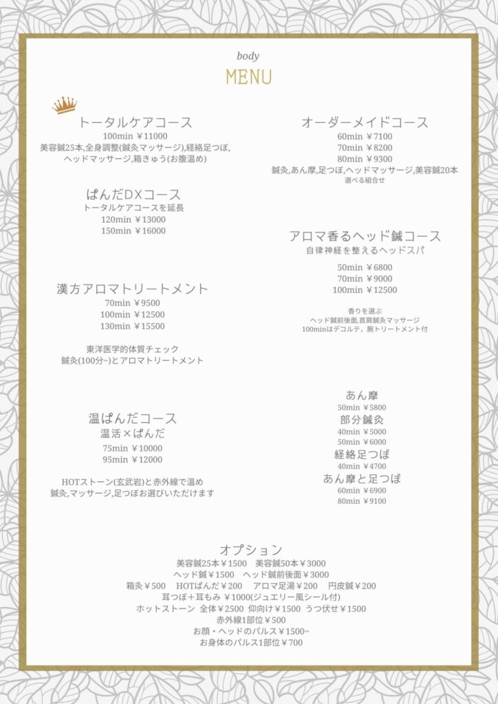 鍼灸・マッサージ・足つぼ 自由に組合せ